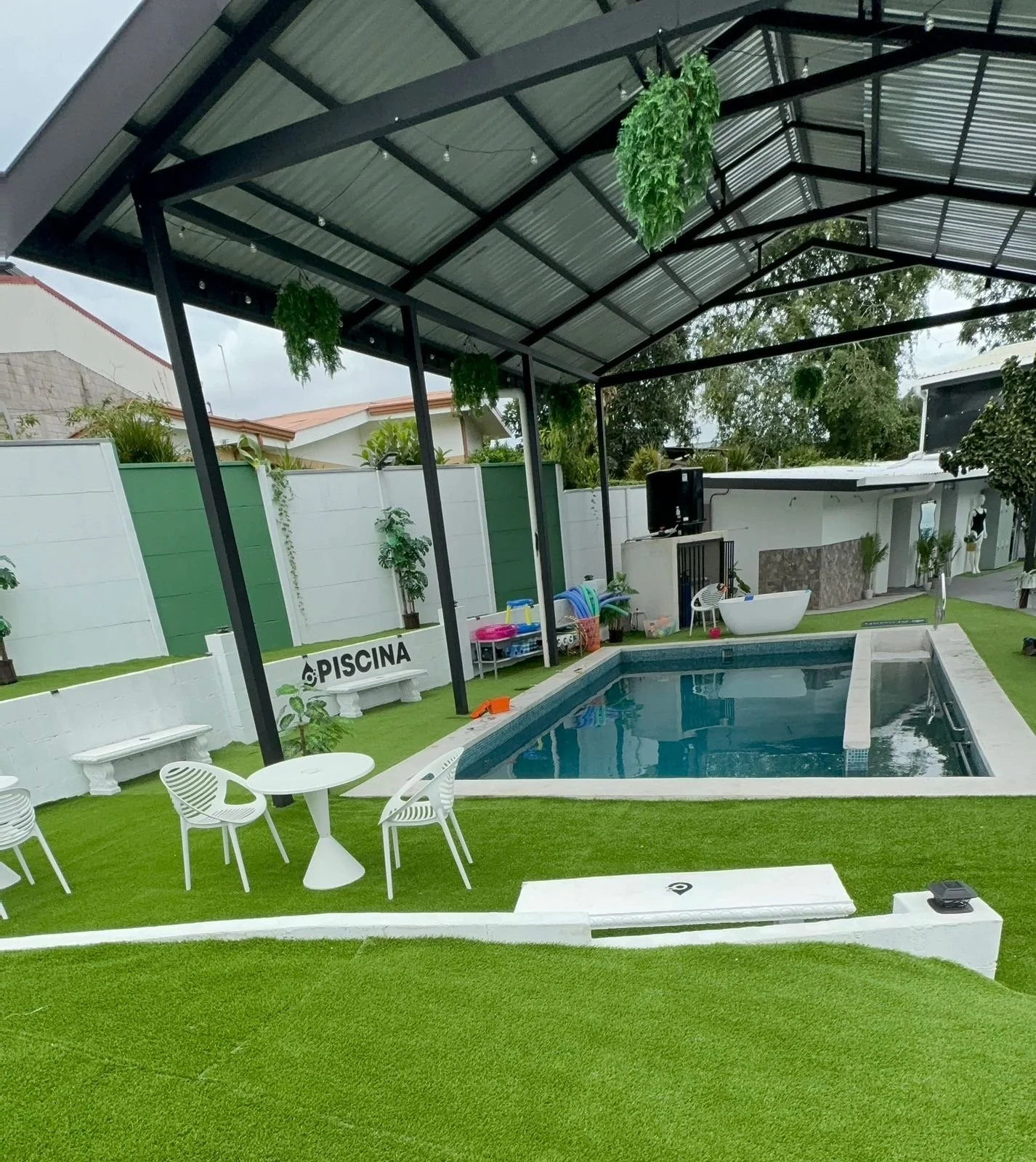 A backyard with a pool and a black metal roof structure. There are white chairs and tables, potted plants, and a green lawn. The pool has a white border and is partially covered by the roof. In the background, there are various outdoor items, a sign
