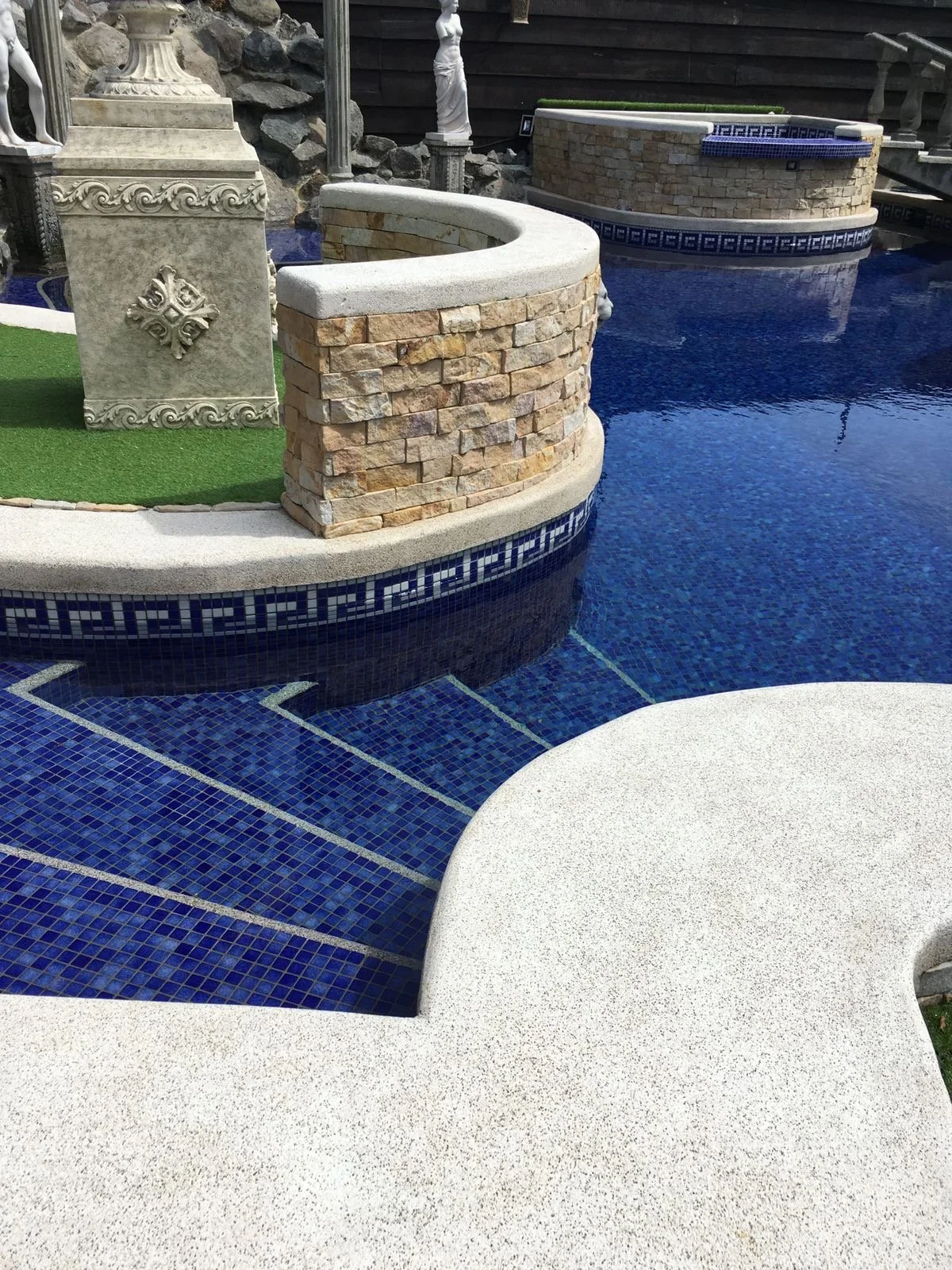 Close-up of a backyard pool with blue mosaic tiles, a textured beige deck, a stone and stucco wall, and decorative statues.