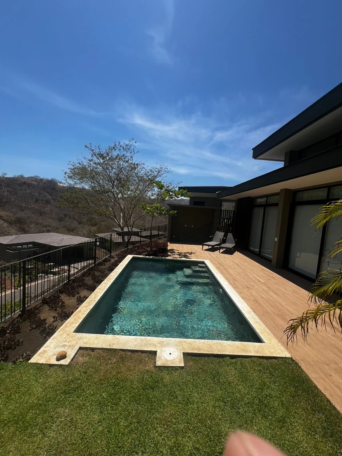 Residential backyard with a modern swimming pool, patio, and surrounding greenery.