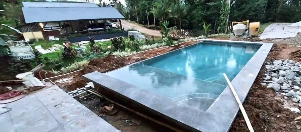 A newly constructed rectangular swimming pool with a tiled border, surrounded by dirt and construction materials, in a backyard with tropical plants and a house in the background.