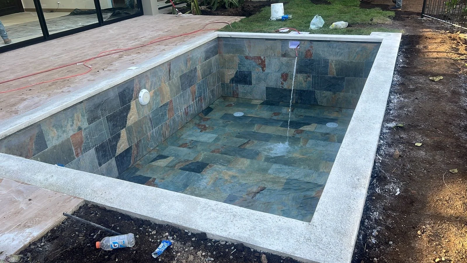A rectangular in-ground swimming pool under construction with slate tile interior and a concrete coping border. Construction tools and debris are visible around the pool, with water flowing into it through a temporary pipe.