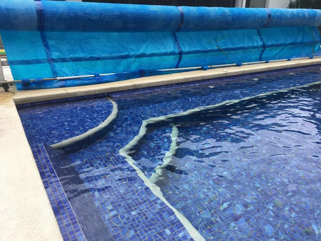 Empty swimming pool with built-in steps and a blue pool cover rolled up on a reel at the edge.